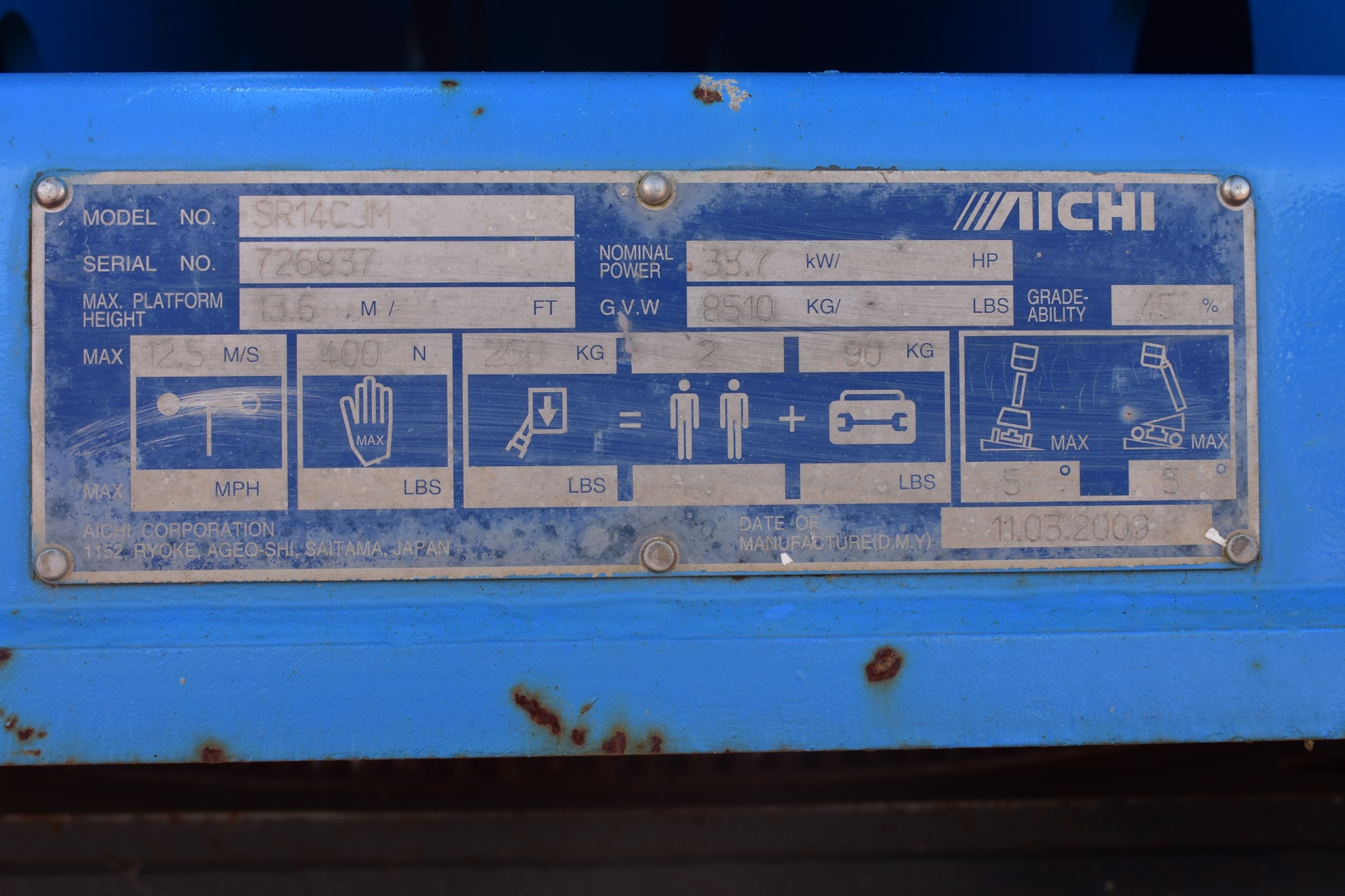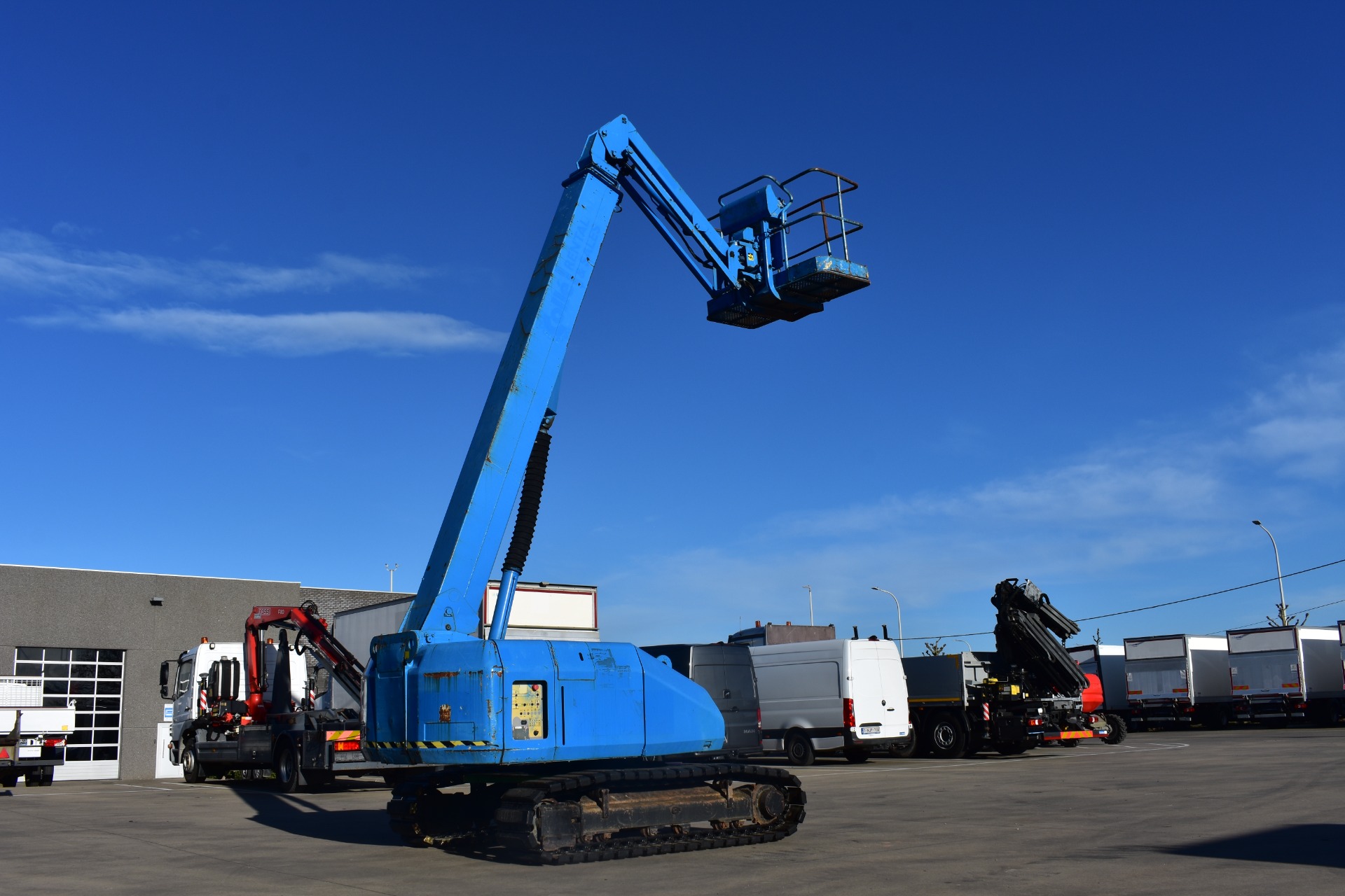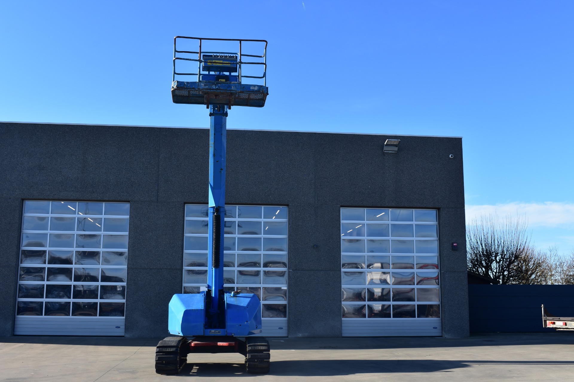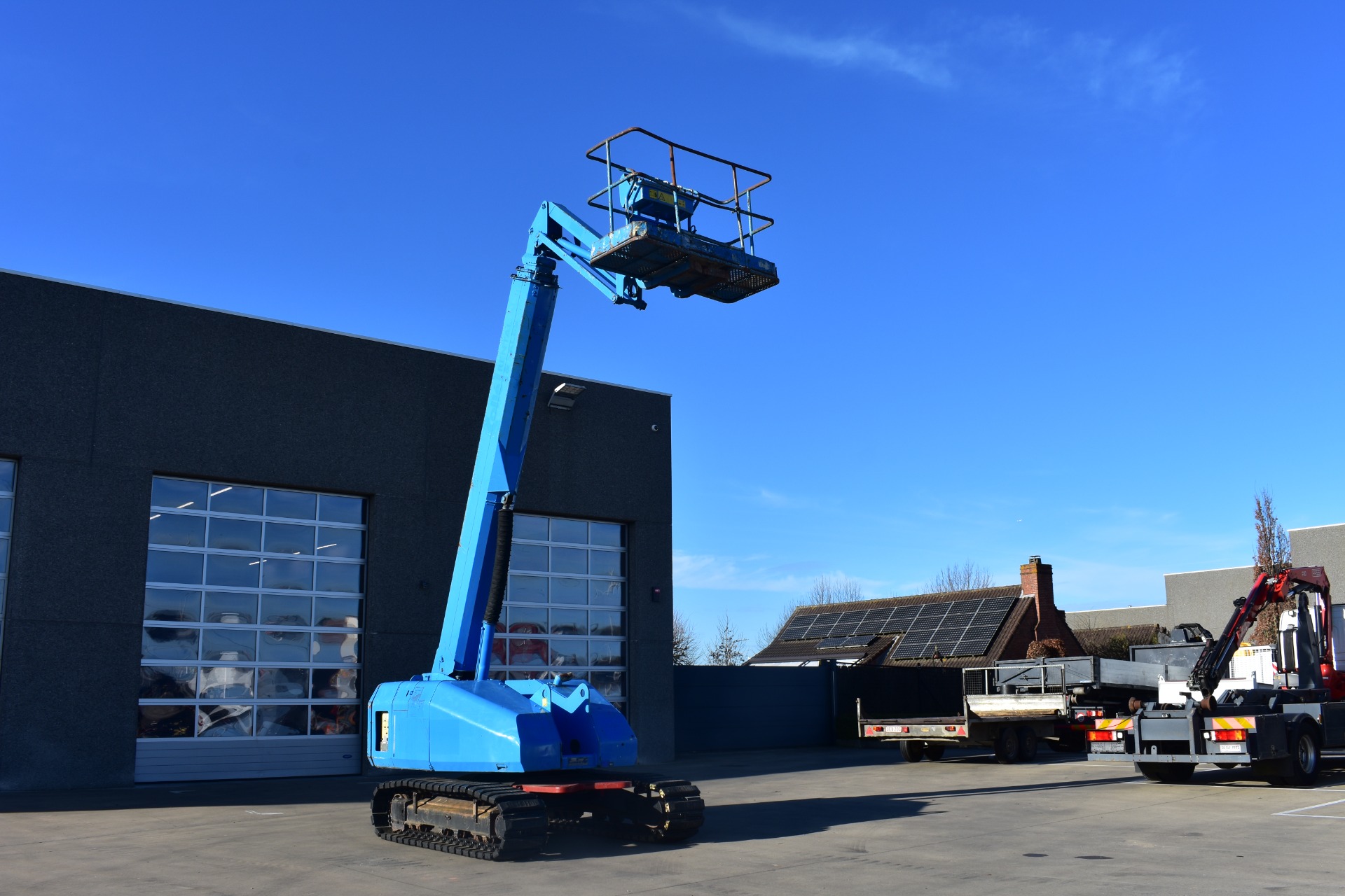 Eigenschappen: Werkhoogte 15,6m; Maximale horizontale verplaatsing: 12,7m; Gewicht: 8510kg; Capaciteit: 227kg (2 personen + gereedschap 67kg)
