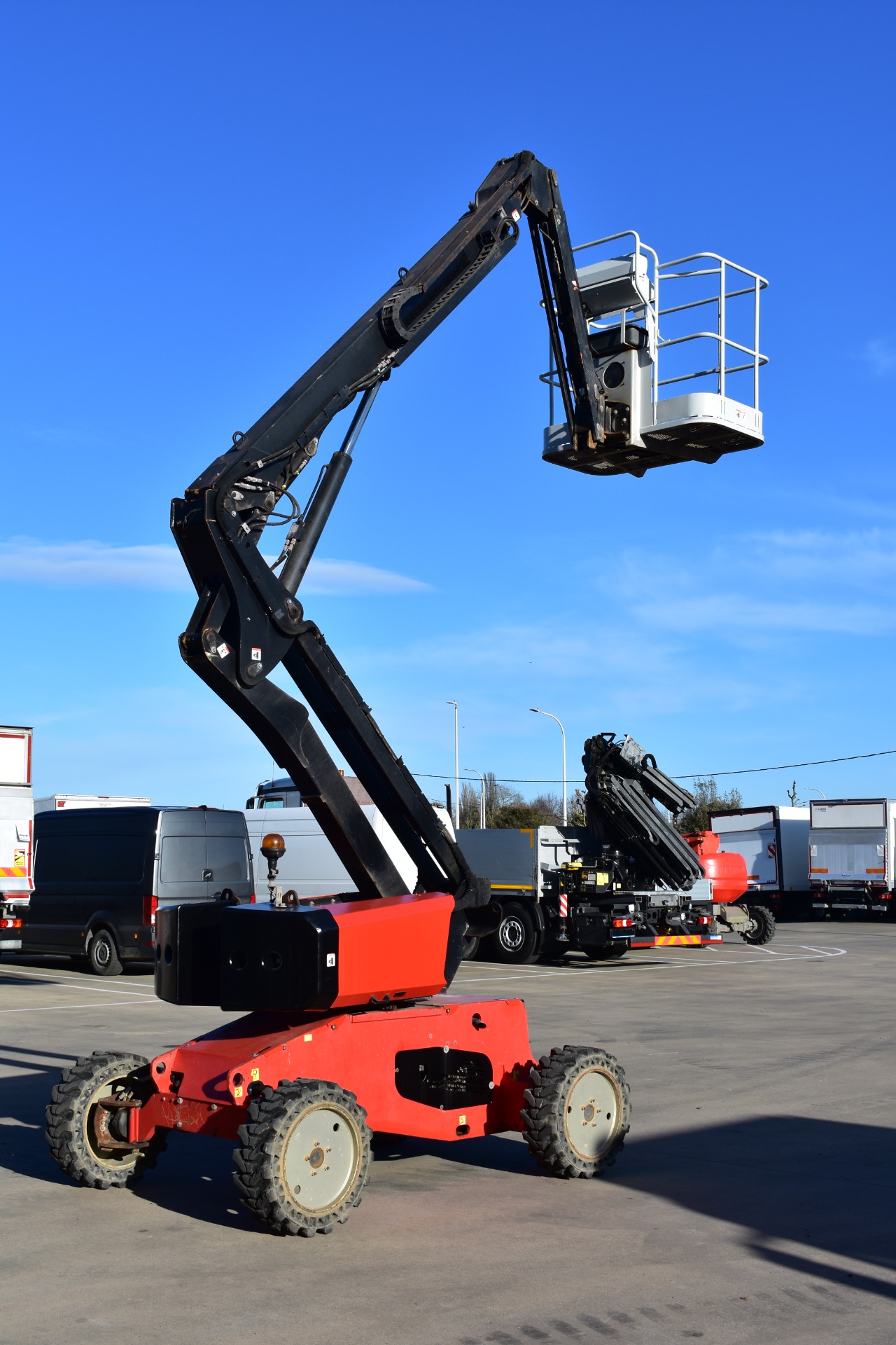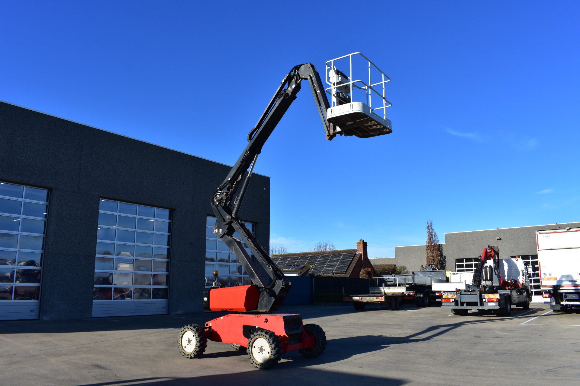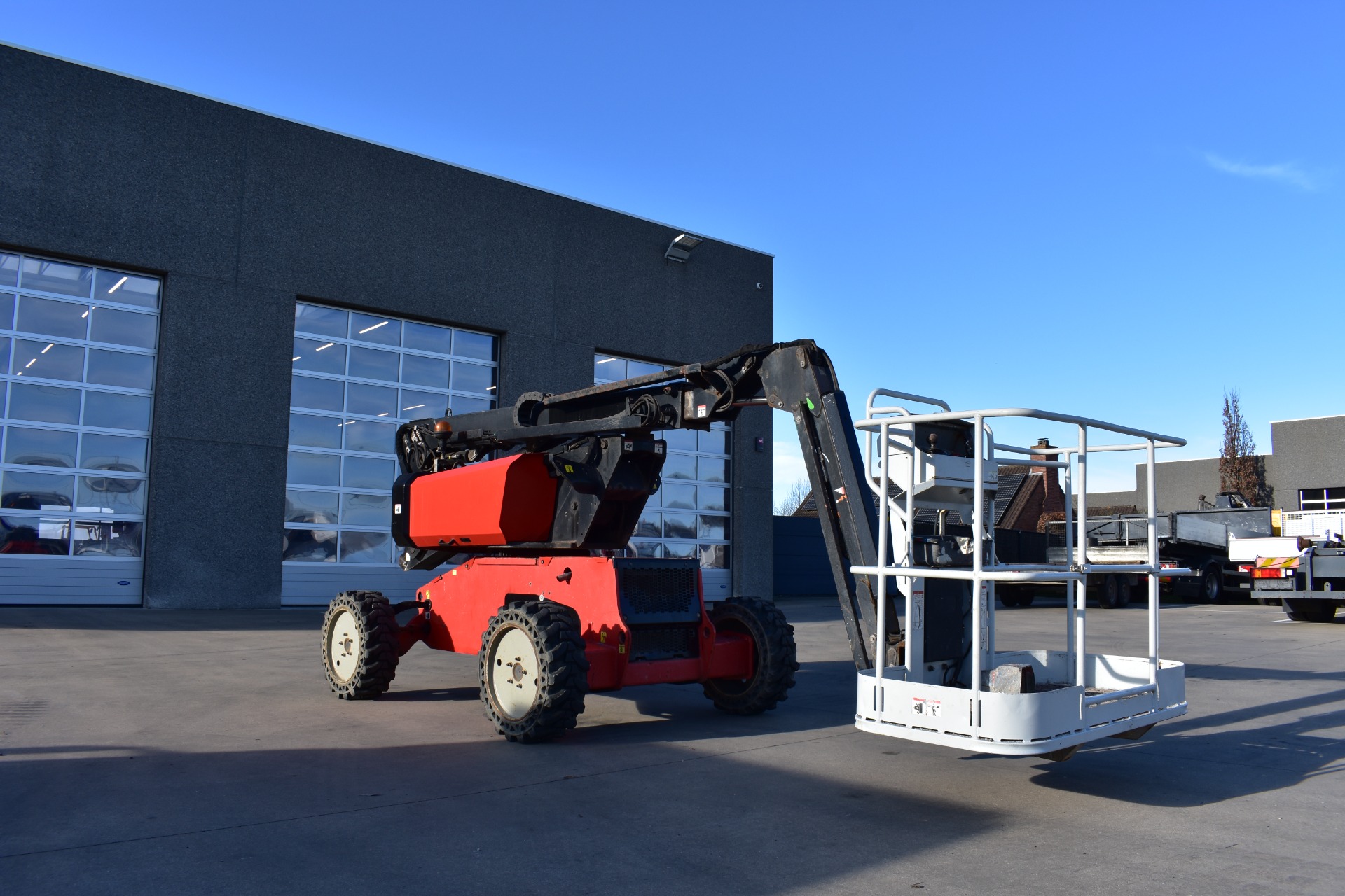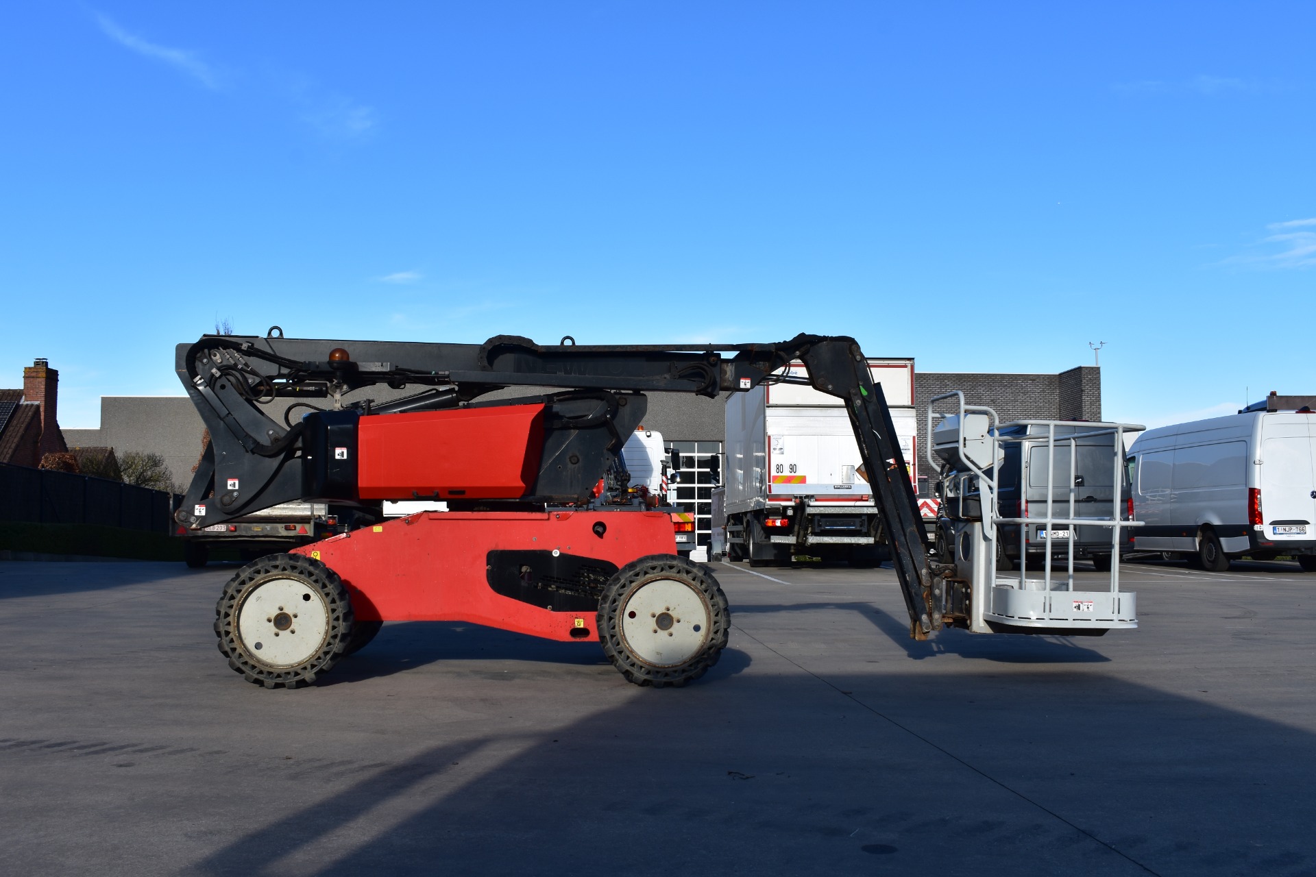 Eigenschappen: Werkhoogte 11,91m; Maximale horizontale verplaatsing: 6,69m; Gewicht: 4150kg; Capaciteit: 230kg (2 personen + gereedschap 70kg)