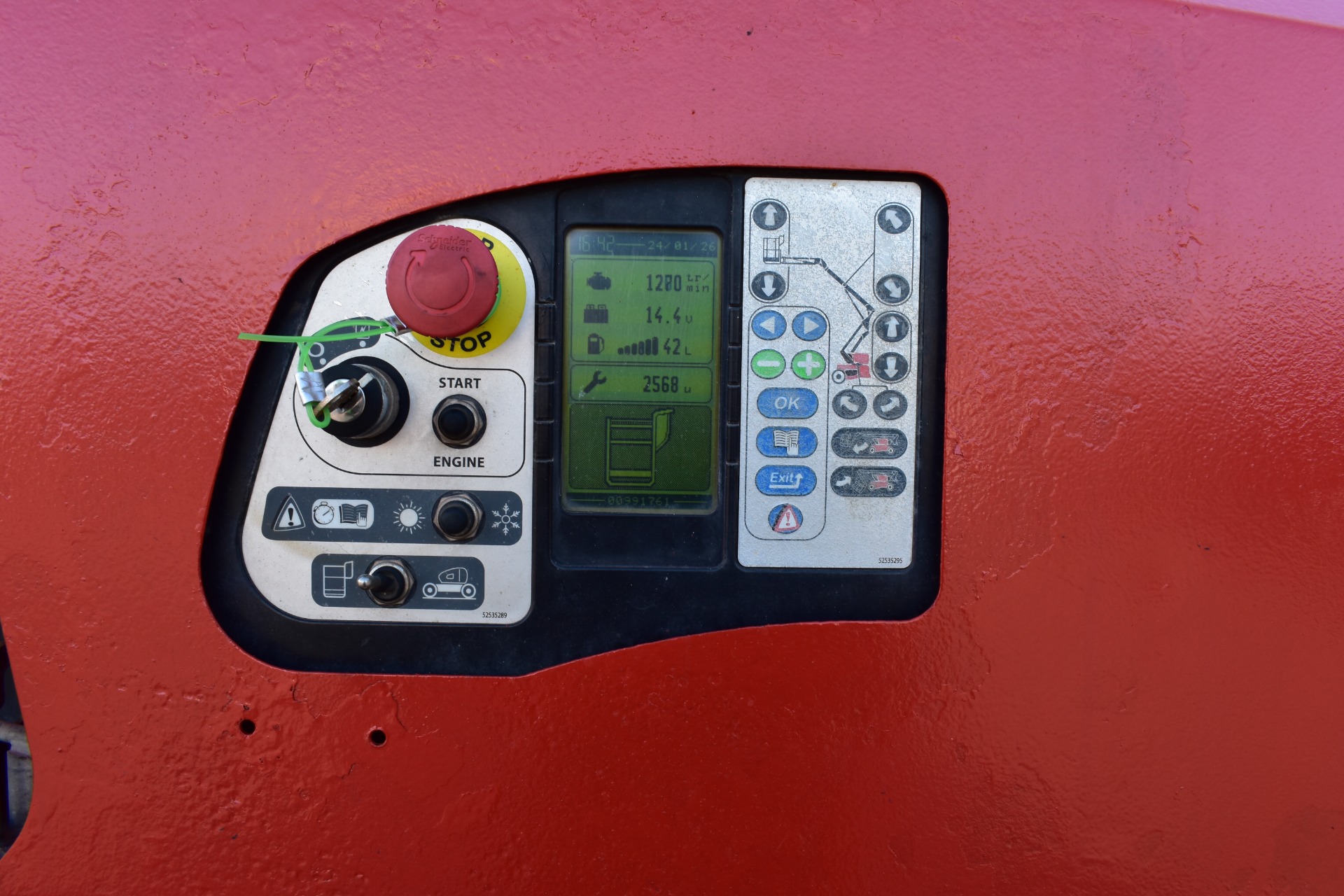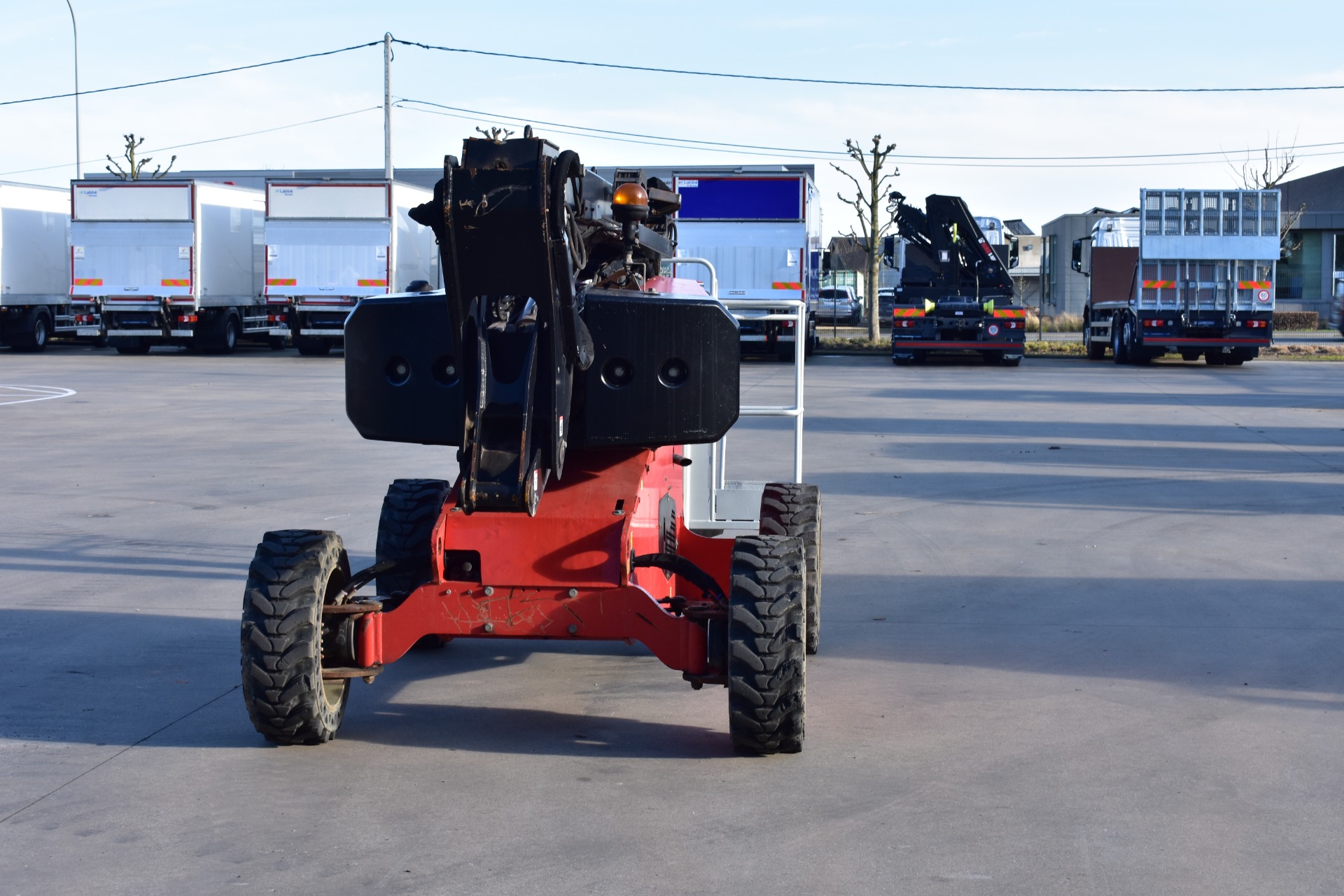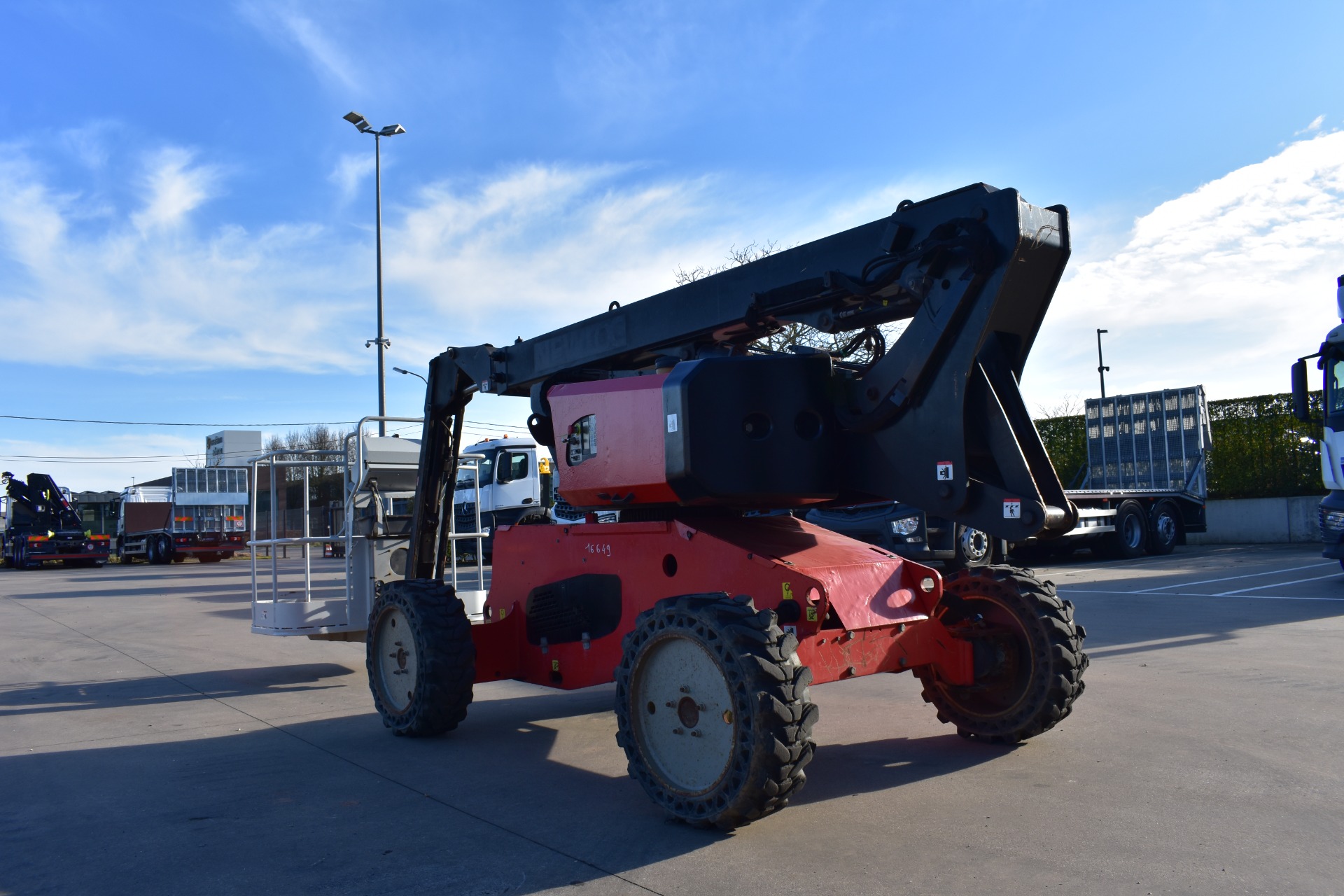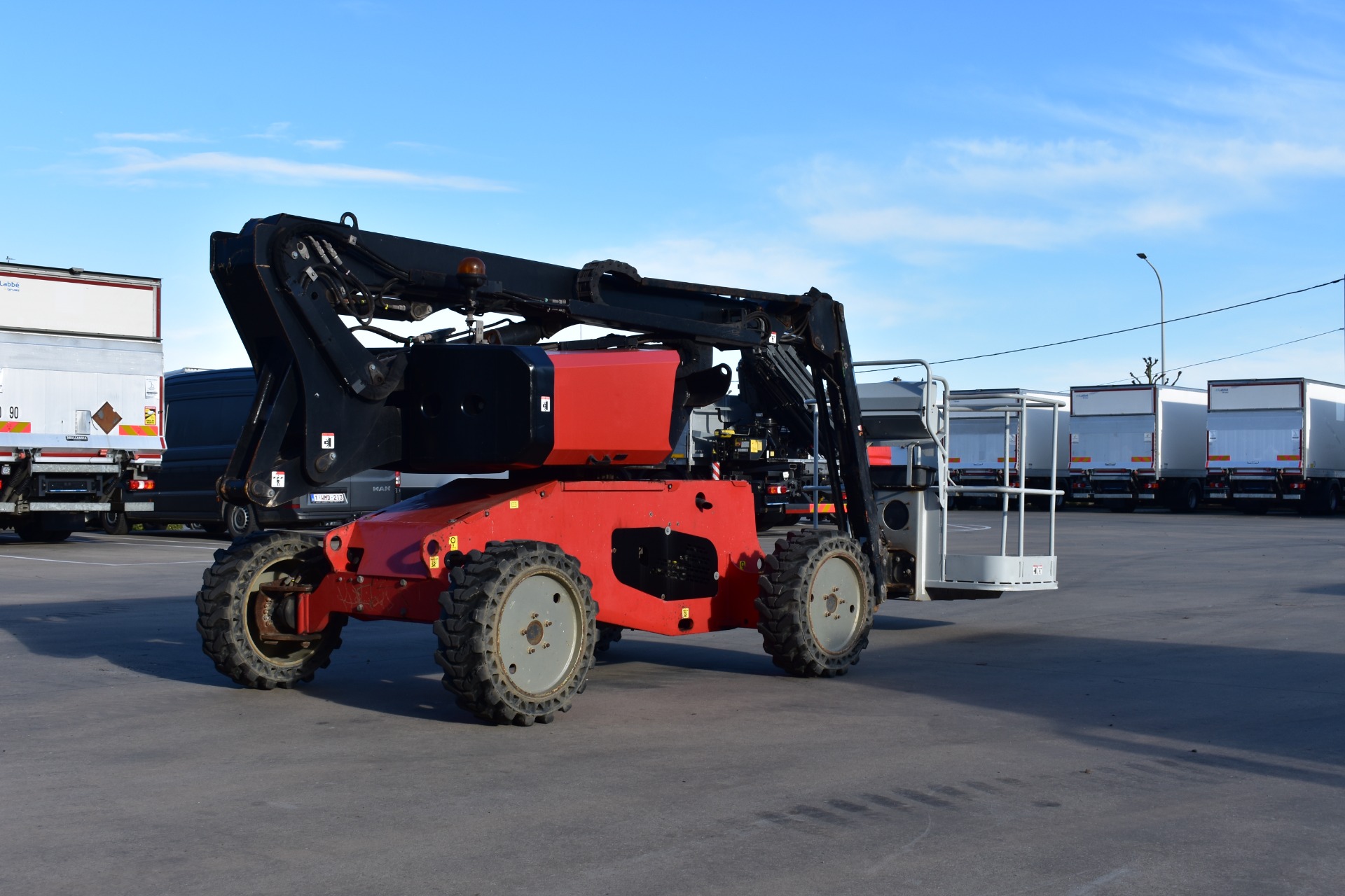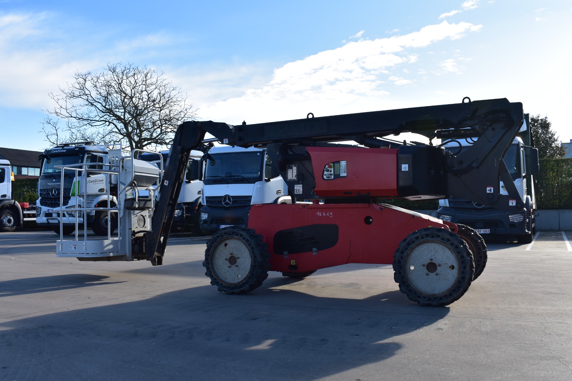 Eigenschappen: Werkhoogte 11,91m; Maximale horizontale verplaatsing: 6,69m; Gewicht: 4150kg; Capaciteit: 230kg (2 personen + gereedschap 70kg)